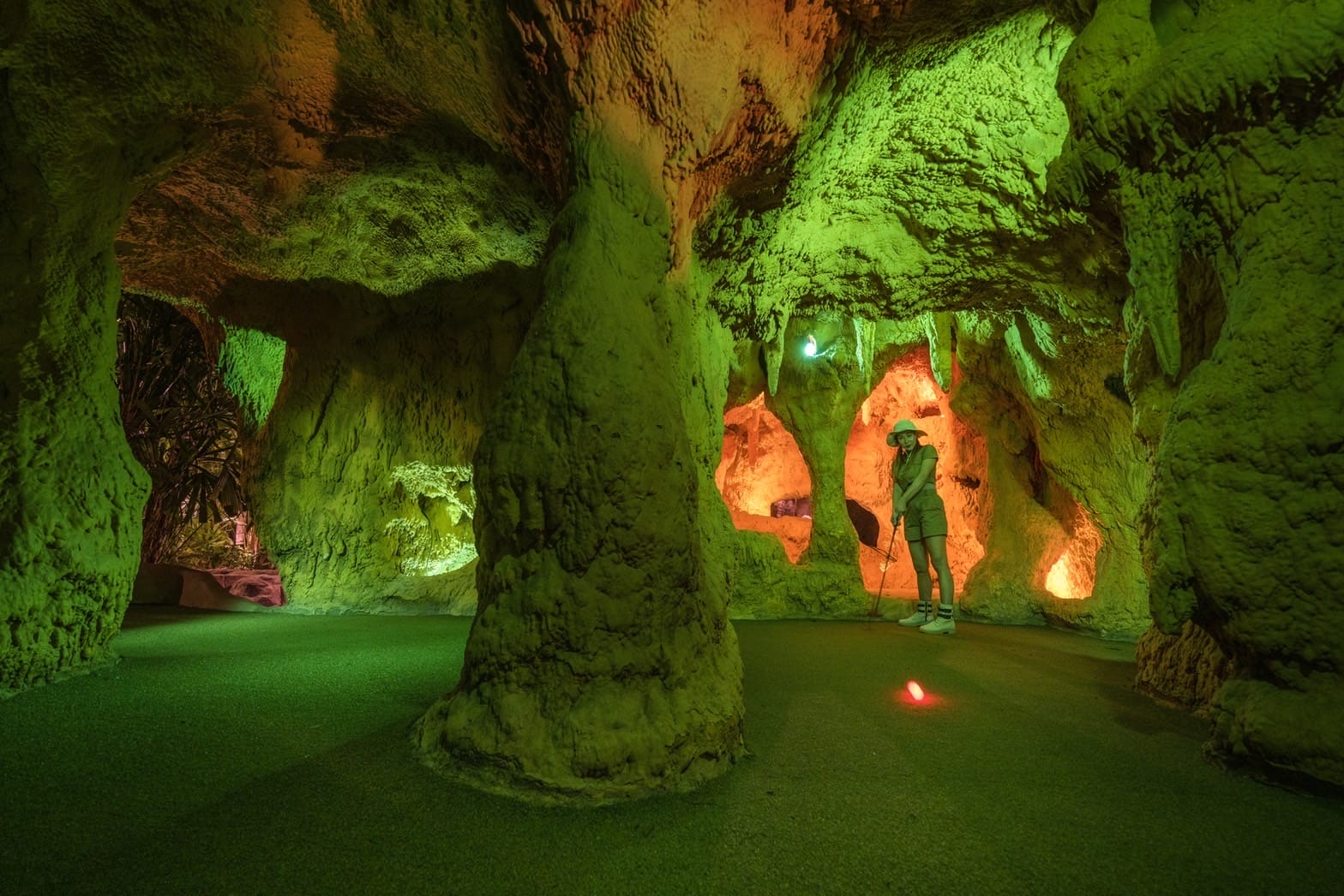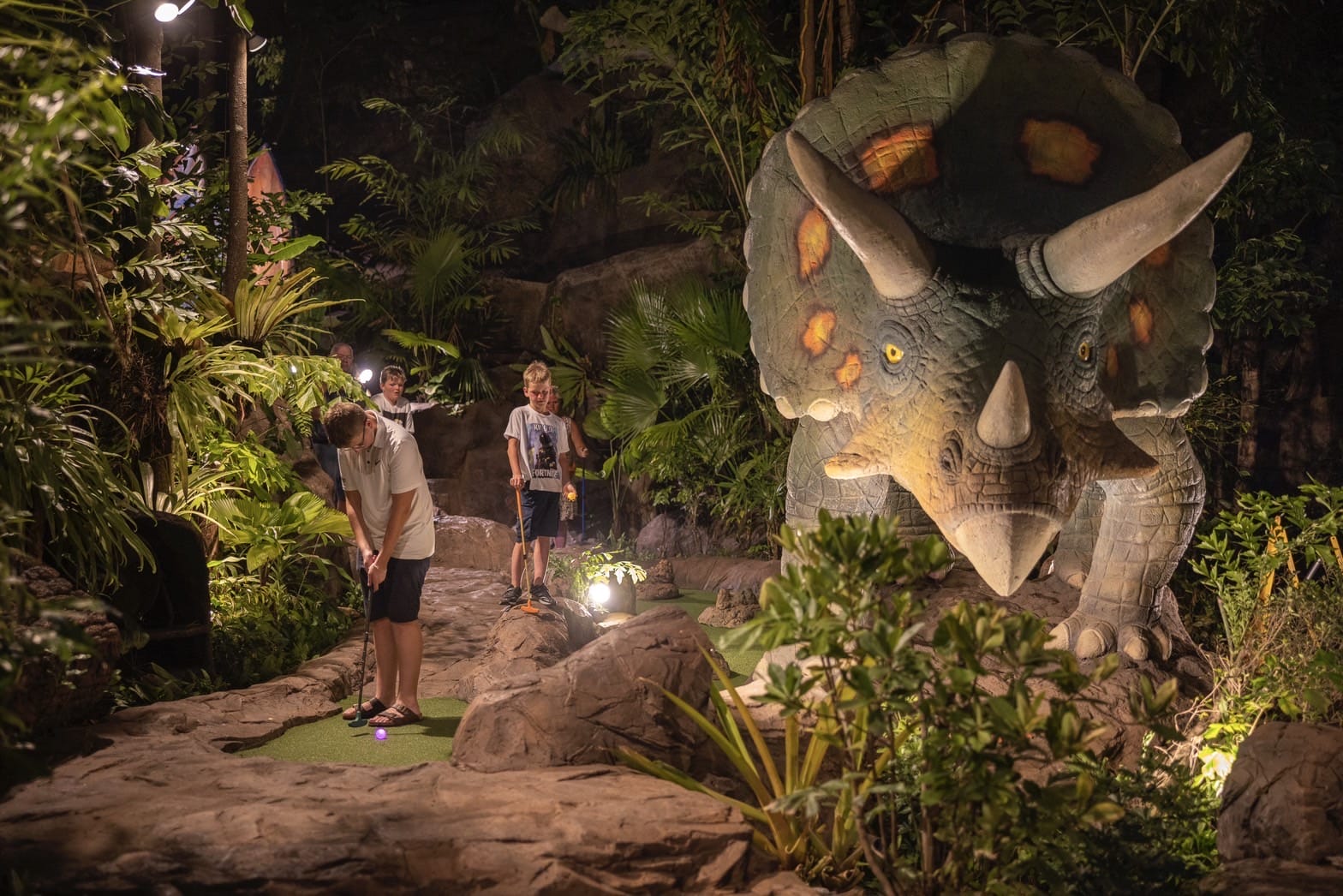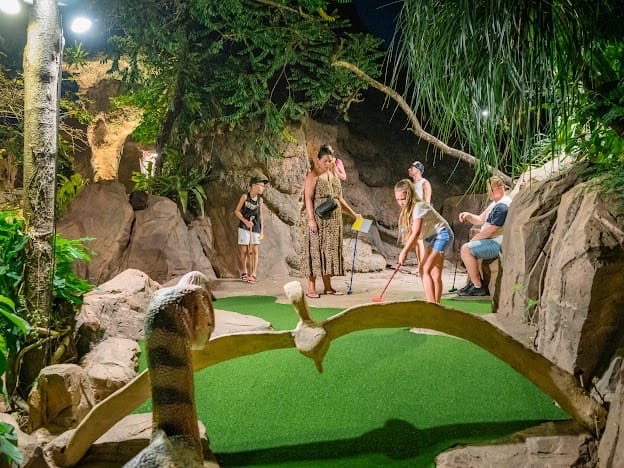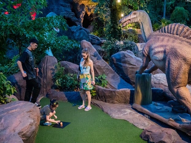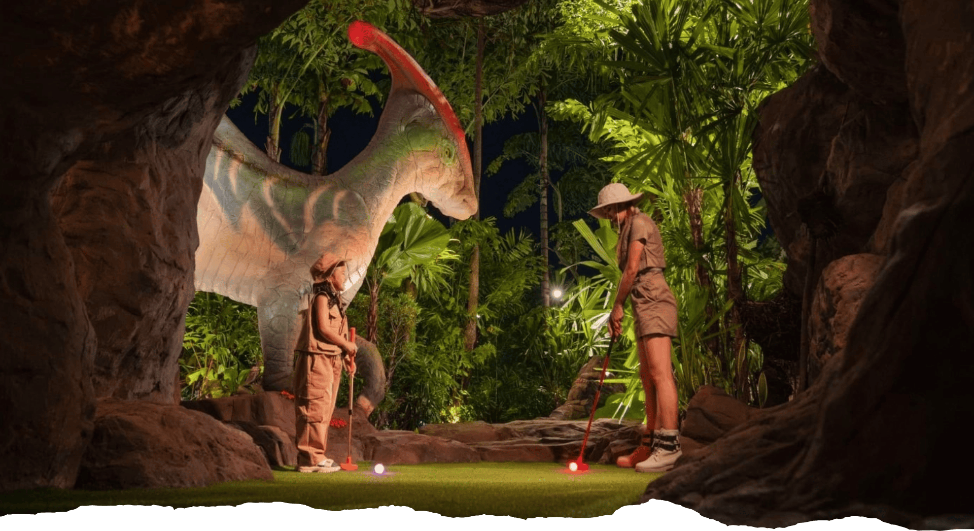 侏羅紀(jì)主題迷你高爾夫球場:18 洞球場貫穿逼真的侏羅紀(jì)世界,沿途分布著多種巨型恐龍模型。目前,公園新增了高水準(zhǔn)電子恐龍,其動作栩栩如生,搭配模擬火山噴發(fā)的先進(jìn)聲光特效,為游客帶來沉浸式的冒險體驗。
