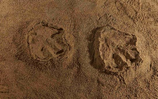 “這個(gè)足跡的爪痕尖銳,跖趾墊非常發(fā)達(dá),表明恐龍腳部穩(wěn)固,幾個(gè)趾頭,尤其是第II趾非常發(fā)達(dá),它的旁邊還保存有一個(gè)小小的,外翻的凸起,這很可能是大拇趾的痕跡,所有證據(jù)都表明這個(gè)足跡與發(fā)現(xiàn)于美國(guó)的暴龍足跡(Tyrannosauripus)非常相似,極可能為暴龍所留下的!邢立達(dá)的腦子里蹦出這個(gè)念頭。