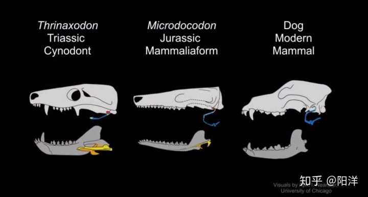(下圖所示早期合弓綱到現(xiàn)代哺乳類的聽骨進化)