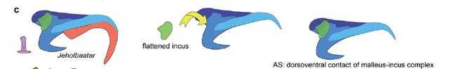 有了這兩種驚人的發(fā)現(xiàn),說2019年時哺乳類進化研究的奇跡之年也不為過,此外,對蓋氏熱河俊獸高精度CL還有個意外發(fā)現(xiàn),就是上隅骨在熱河俊獸中處于從一塊獨立的骨骼逐漸變成與錘骨體愈合的狀態(tài),成為錘骨的后外側(cè)部分,這為中耳骨骼的同源性討論提供了重要證據(jù)。最后值得一提的是這兩種早期哺乳類都是在我國發(fā)現(xiàn)的,其實不只2019年,今年來我國的早期哺乳類研究獲得了很多重大突破,相信不久的未來還會有新的驚喜。