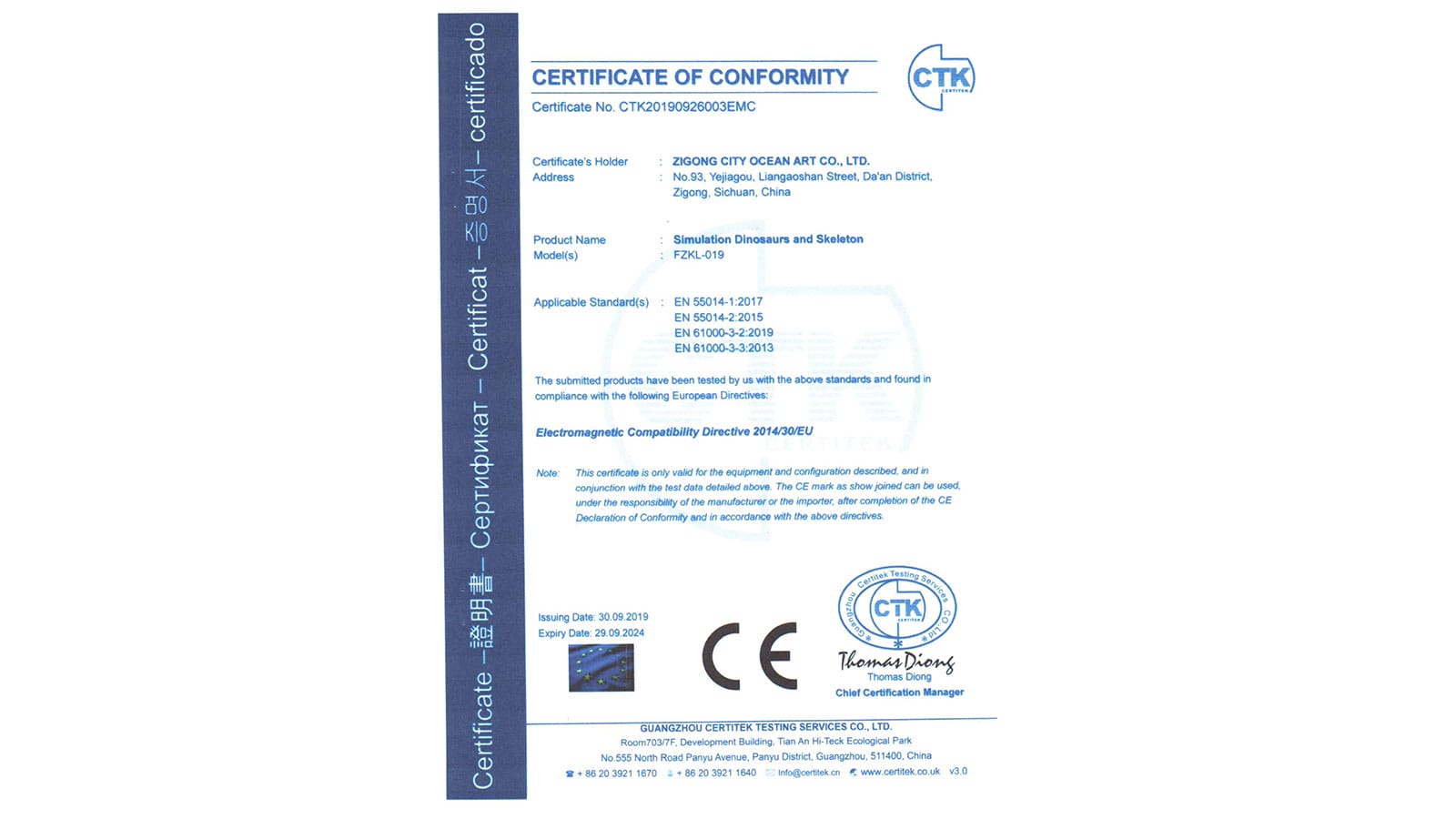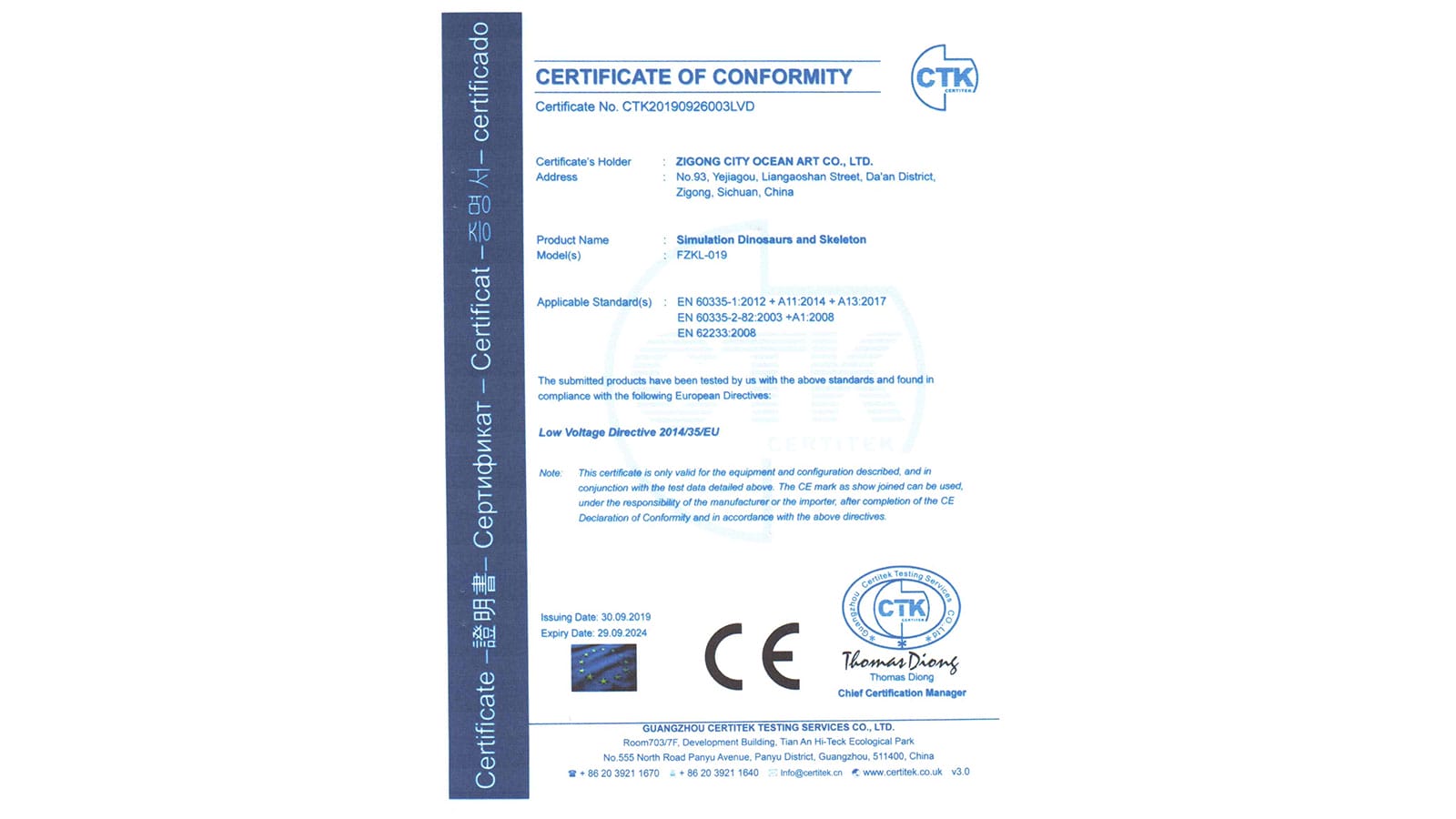 CE認(rèn)證證書(shū)(仿真恐龍)
