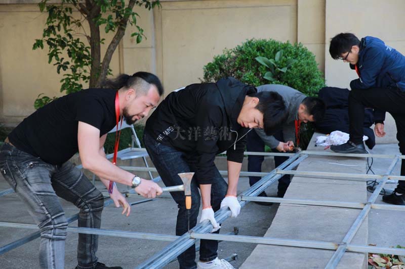 4月13日,師生團隊一行抵達參展場地,在江毅、楊劍、黃磊三位老師的指導下,師生齊心協(xié)力,緊張有序的進行布展工作。