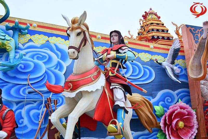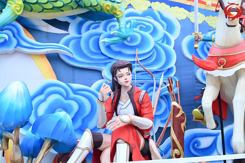 燈組是以我國(guó)古代歷史上的“四大美女”和“四大女將”為創(chuàng)意原型,古代四大美女分別是西施,王昭君、貂蟬楊玉環(huán),古代四大女將分別是花木蘭、穆桂英、秦良玉、馮婉真。燈組用一幅巨大的畫卷將這些秋絕色的美女串在一起,各展風(fēng)姿風(fēng)采,展示了中國(guó)古代女性各自不同的獨(dú)特美麗。燈組鋼架結(jié)構(gòu),絲架造型分色裱糊,首次用藝術(shù)夸張的手法塑造了一個(gè)個(gè)高大而漂亮豐滿而風(fēng)韻的美女,飄逸的服飾、精致的色彩,優(yōu)雅的動(dòng)感讓人仰望慕之