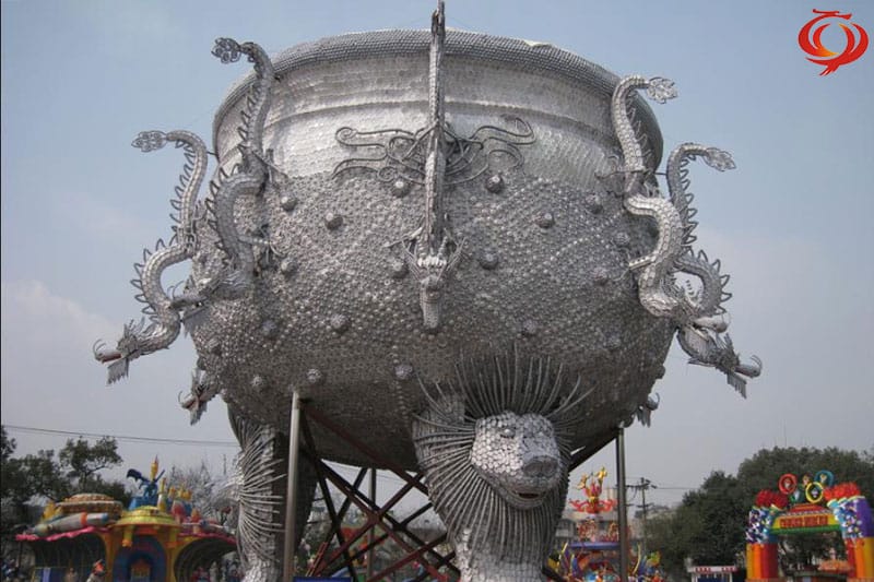 “九龍鼎”采用景德鎮(zhèn)青花玲瓏瓷具杯、羹、匙、盅、盤、碟、碗等近30萬件手工捆扎而成,主體為鋼結(jié)構(gòu);鼎高和直徑均為18米,最大處直徑26米,總重近100噸。其創(chuàng)意深邃,規(guī)?;趾耄に嚲?,史無前例,令人震撼,為世界之最,堪稱“燈王”。 自貢燈會(huì)九龍鼎入選中國(guó)世界紀(jì)錄協(xié)會(huì)世界最大九龍鼎,創(chuàng)下中國(guó)世界紀(jì)錄協(xié)會(huì)新的世界之最。